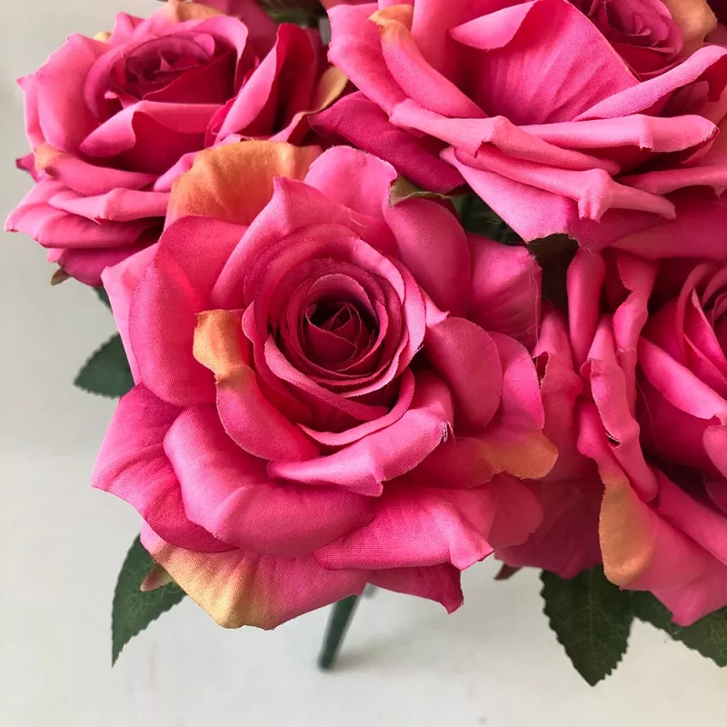 고품질 인공 장미 꽃다발은 종종 실크 직물을 사용하여 꽃잎을 만듭니다. 꽃잎은 터치에 부드럽고 섬세한 색상의 색상이되며 플라스틱 및 철 와이어 구조는 가지의 소성과 견고성을 보장합니다. Ouli® 의이 가짜 장미 꽃다발은 실크+플라스틱+철의 조합을 사용하여 모양이 쉽고 3 차원 의미를 유지하며 붕괴하기 쉽지 않습니다.